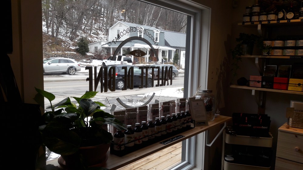 I had the pleasure to visit Christine at her place in Mont-Tremblant, a very trendy place an hour and a half trip by car from Montreal. A super cute shop, fairytale like with this dim light, wooden panels and whole range of gorgeous products: chocolate bars, both hers and others, but honey, maple syrup, caramels filled chocolate hedgedogs, pies made with her chocolate… It made me feel like a kid in a candy store! As you can see on the picture, she is also making scrumptious chocolate paninis from cinnamon and raisin bread, filled with her chocolate. Homemade hot chocolate is always on display, waiting for you to try it…